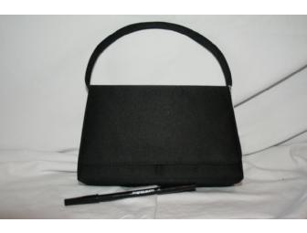 Small and elegant black satin purse. The perfect purse for that little black evening gown. Top flap closure with just enough room to hold the essentials of the evening.