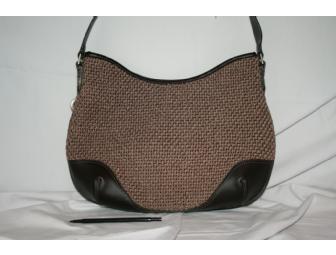 The Sak Purse! Woven fabric secured on top of a leather outer. Single shoulder strap with zip top closure.