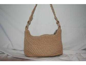 This handbag from The Sak is perfect for that casual, everyday look and feel. The signature style interlocking weave form is featured in a neutral tan with matching rings flanking the sides for an added feminine touch. Full zipper enclosure opens up in to a tan waterproof lining perfect for the water-bottle carrying woman on the go!