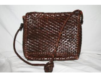 Talbots brings you this brown leather purse in a basket weave style. This bag is lined in a cocoa colored cloth fabric with a flap cover enclsoed by a magnetic snap fixture. The back side has a full zippered pocket and the bag hangs comfortably on your shoulder with the leather cord strap.