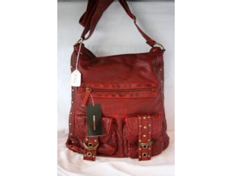 BCBG Maxazria brings you this signature TEX book/day/shoulder bag in Ruby! Still has the tags! Polyvinyl shell and polyester tan lining, brass hardware, dual front pockets, fully zippered main compartment, and additional zip pockets on both front and back.