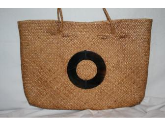 This straw-woven tote is perfect for a day at the beach or light-weight daybag. It has dual braided handles and has an artistic o-ring embellishment on the front.