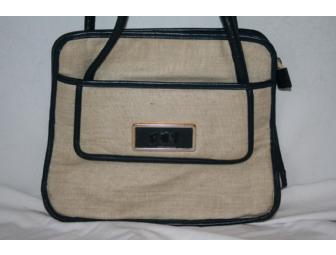 Who know who made this fabulous bag but it is pretty darn cool. It has the shape of a vintage bowling bag with a cream canvas material. There is a main compartment with a full zipper enclosure and the fabric within is an easily cleaned polyester material. The outside features a slit pocket on the front and back. An additional flap pocket in front reveals a beautiful face mirror and additional zipper pocket for all your makeup goodies. Navy blue trim and gold hardware adds to the vintage class of this handbag.