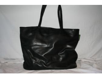 Unlisted Kenneth Cole Black Vinyl Oversized Tote features a bright lime green interior, single snap enclosure, large dual rolled handles, and an easily cleaned body for a fabulous bag you can quickly grab and go in style! This bag is used and in good condition, the body is exceptional however the interior has some staining on the bottom.