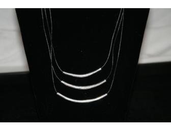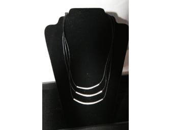 This Silpada black leather necklace features three cords with individual silver accents on each cord. All three are tied together at the back and clasps together with a silver hook clasp closure.