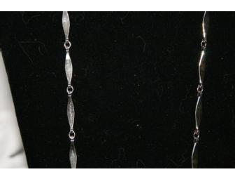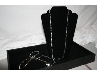 This silver necklace features small flat plaque pieces chained together to make up this fun fashionable costume necklace. It can be work long or doubled up.