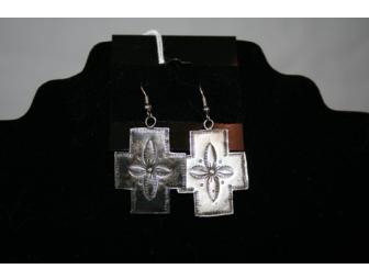 These sterling silver earrings come in a large cross shape with a floral imprint/etching in the middle of each. Addiitonal etching tick marks on the edges.