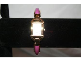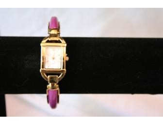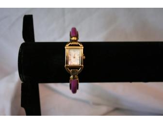 Avon brings you this fashionable gold watch with purple siding. Features a quartz face that has a nice mother-of-pearl accent to its coloring. Band is bendable at the face and opens up to clasp on to wrist...No buckle! No hassle! Analog watch includes directions. Never been used.