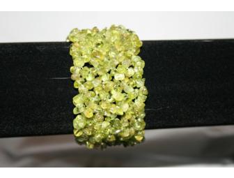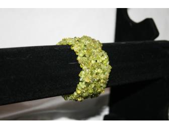 This cuff bracelet is stretchy and features sage green rock-like beads.