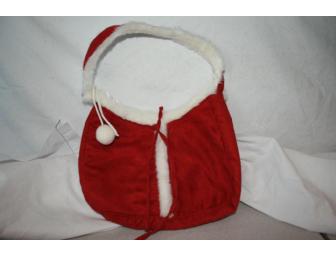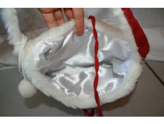 Perfect for your upcoming costume party! This Santa style purse is soft and fuzzy! It features a deep red material and off white faux fur edge lining. The purse is lined in white silk and ties closed with two red laces.