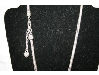 This stunning sterling silver Brighton necklace features a rope style chain and has three distinctly styled beads accenting it. Heart shaped charm accents the enclosure.