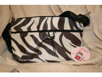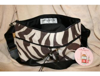 This brand new Sally Spicer original "Baguette" handbag in bengal is made from a washable faux suede material and a black washable material lining the interior. Made in San Francisco.