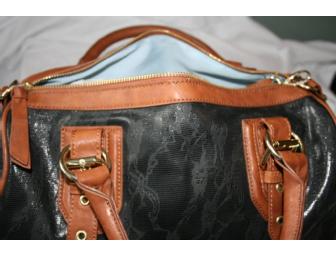 This Steve Madden convertible handbag in black and tan is in the style of a Dooney & Bourke tote. It features a black floral pattern on the shell and brown leather trimming with gold hardware. Baby blue interior and brown leather shoulder strap included.