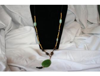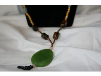 An array of semi-precious stones adorn this necklace including jade, tigerseye and rose quartz. Extra long.
