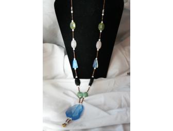 This necklace is long in length and features several semi-precious stones in both blue, black, pink and green.