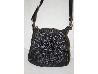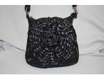 Stay in style with this Steve Madden mini purse. Black pleather shell with floral sunburst accent. Silver hardware and black interior.