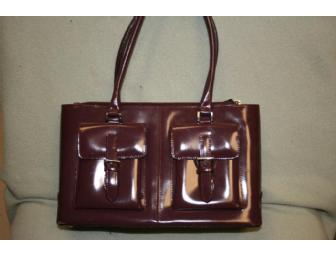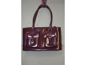 Nordstrom genuine leather handbag in plum. Silver buckle outer pockets, dual rolled handles, full zipper main compartment, clean black washable interior.