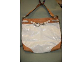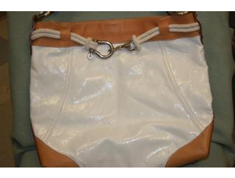 This oversized beach bag has a sailing motif interior lining and features a tan cow leather trim on top of a white pvc shell. White sailing inspired rope and buckel accent the trim. Large flat shoulder strap. Could be reversible. Made by Via Spiga!