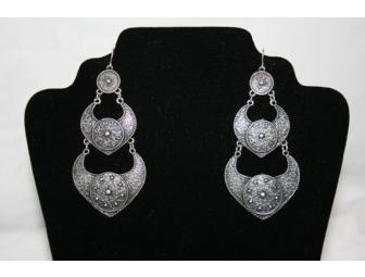 These tree tiered earrings feature a unique design and are antique in style with the brushed silver.