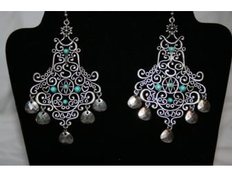 These chandelier earrings feature antique silver and turquoise bead accents.
