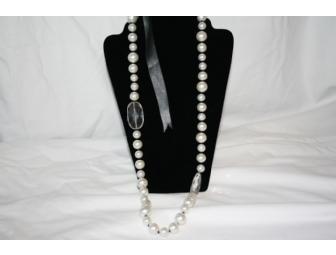 Tie-On Black Ribbon Necklace w/Large Pearls & Clear Gems