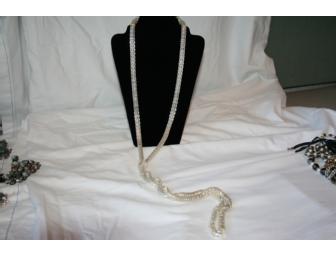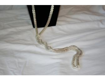 This lightweight, slip on necklace is long and features a silver tube style chain that wraps around itself and disconnects at the bottom.