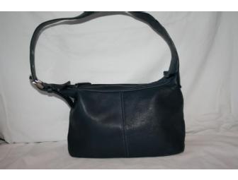 This navy blue Tignanello signature handbag features a zip top main compartment and a flat, adjustable shoulder strap.