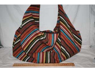 This oversized tote is easily washed and features a vertical stripe material. Zipper enclosure and dual flat straps.
