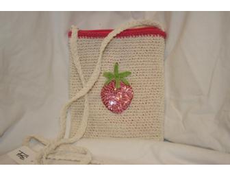 This small napsack purse crocheted with whites and pinks and features a sequined strawberry on the front. Pink INterior, long shoulder strap, zipper closure.