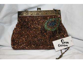 This Susan Collection clutch features a peacock feather image adorned with beads and sequins. Antique brass closure and chain.