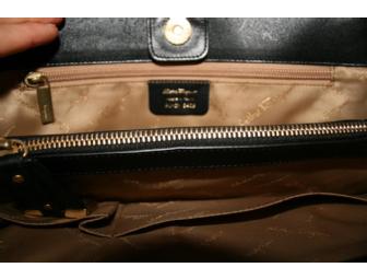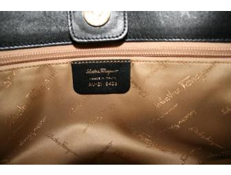 This Salvadore Ferragamo is in excellent condition and looks like it has never been used. Sumptuous black leather, brass-gold hardware, dual rolled handles, and an exquisite tan interior lining for the multiple compartments.