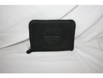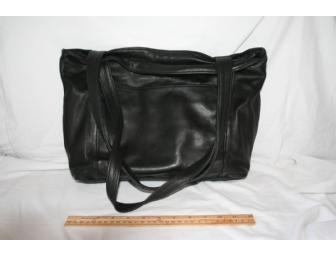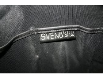 This black leather tote is made in Berkeley by Sven. Dual flat shoulder straps, outer slit pocket, outer zip pocket, main zip compartment reveals drop pockets and zipper pocket. We're throwing in a Mandarina Duck Wallet on top of this already great deal!
