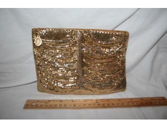 This gold chain meil clutch is made by Whiting & Davis and features a zip closure and cinched front.