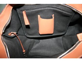 This Dooney & Bourke black canvas tote features tan leather accents including pockets and rolled handles.