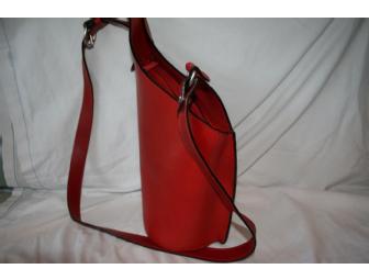This is an absolute find! It is terribly difficult to find an original Toohey Dodge leather handbag. This one in particular features red leather through out and a modern structure and shape. Zip top closure, flat shoulder strap with silver hardware and hint of black lining.