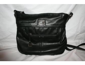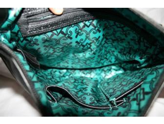 This petite shoulder tote by Stone Mountain features a wonderfully soft black leather with signature silver accents. Shoulder strap is adjustable and don't pass by this bag without checking out the gorgeous teal and black silk interior that really make this bag a gem.