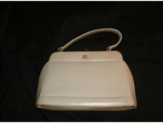 Cream-colored leather, classic vintage style. Gold accents & snap closure.