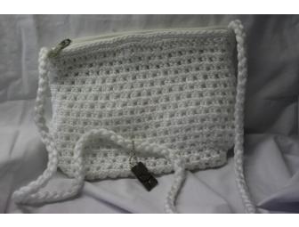 Crochet white purse by Lina features zip top and single braided shoulder strap.