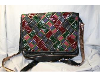 This Samir original messenger tote features an array of woven straps on its flap cover, gold shoulder strap, and large compartment.