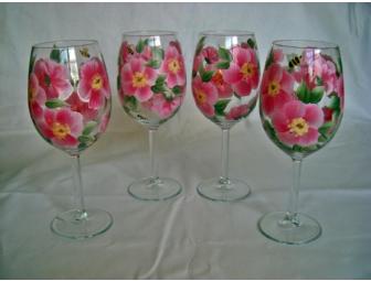 Looking for a unique and ocean-themed gift for yourself or a loved one? Bid on these four lovely hand-painted wine glasses. Each glass is decorated in a pink beach rose and bumble bee design that will bring back memories of summers by the sea!