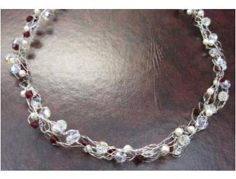 Pearls, deep red crystals and clear crystals with an aurora borealis finish are crocheted on anti-tarnish silver wire and braided into a 17” delicate, lacy necklace. Handcrafted by Susan Scott, Area Manager-Employee Communications on the AT&T Five Star team. Retails for $95.