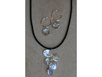 Trend setting white 2-inch 5 keishi pearl drop on black velvet necklace will look stunning on any outfit. Pearls average 15 cm. Matching earrings on sterling silver 1-inch hoops. Extra 19-inch adjustable white multi-strand cord necklace included.