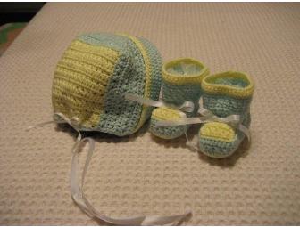 You are bidding on a hand - crocheted Yellow and "baby" Green hat and booties set. Size is Birth to 3 Months.