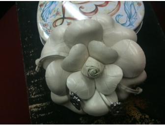 You are bidding on a lovely off-white leather Brighton Flower broche with silver accents on the bow. This can be attached to a jacket, purse, or scarf and is a definite statement piece. This lovely flower measures 3.5 inches diameter and is sure to get you many compliments. She comes in her own Brighton heart tin for safekeeping. This item comes from both a smoke and pet free home.