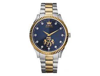 Three hand. Polished yellow gold and silver tone case and bracelet. Textured yellow gold tone dial with stones for hour markers.