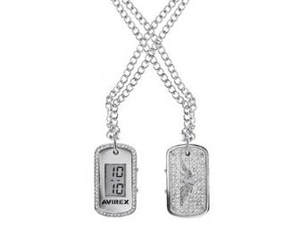 This iced-out dog tag from Avirex doubles as a digital timepiece. Worn around the neck, this cutting-edge accessory frees your wrist. Studded with crystals and a silver-tone Avirex logo on one side, the dog tag flips over to reveal the hour and minute with a vertical digital display, surrounded by a crystal-studded bezel.