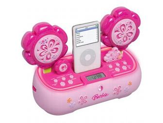 Barbie Petal Sound Systemfor iPod. Girls can listen to their music in style with this fun Made for iPod speaker system, featuring bright pink and purple flower speakers and light pink buttons. The Barbie Petal Sound System Made for iPod includes a pink gemstone fun button that activates a light ring around the system. The speaker system features a Made For iPod top-mounted docking station, 2 dynamic full range speakers, stereo headphone jack, RCA video out jack and an alarm with snooze button. The system works with Apple iPods® (including Mini, Nano, 5G, and Video) as well as our Barbie Petal MP3 Player and recharges iPod batteries when connected to the docking station.