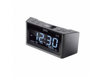 The jWin JL355 is a jumbo-sized LCD digital alarm clock radio with dual alarms. Fall asleep to radio and wake to AM/FM radio or buzzer, or hit the snooze for another 9 minutes of rest. Features PLL digital tuning technology for clear reception, 40 programmable presets to mark your favorite radio stations (20 FM and 20 AM), dimmer to adjust LCD display brightness, built in speaker, aux-input for mp3, iPod, and other audio devices, and battery backup which requires 3 AAA batteries (not included).