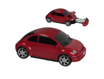 This authentically styled car has headlights that turn on/off when the power is turned on/off. The hood lifts to reveal the LCD control panel and the front bumper slides out to reveal the CD tray. With the power on, press on the left headlight and the CD tray opens and closes and the right headlight will play/pause your CD so no need to keep the hood raised to access these functions. There are functions for volume, radio scan, reset, forward skip, backward skip, play/pause, stop, repeat, CD door open & close. There are also controls for power off, CD, FM and volume. There are stereo speakers hidden inside all 4 wheels for great sound. There are 3 adapter ports on the rear bumper for audio out, power adapter and headphones.