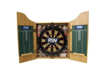 Keep the classic game of darts simple with the Bristle dartboard with wooden cabinet. Features a regulation-size target made of self-healing bristle board, so even if you hit the bullseye multiple times, the surface stays intact. The ring of numbers rotates, so no scoring area gets overused and the board lasts longer. Keep track of your hits the old-fashioned way with the chalkboard scoreboard. The game set is housed in an attractive wooden cabinet, which can be easily wall-mounted. Includes 6 deluxe brass darts.